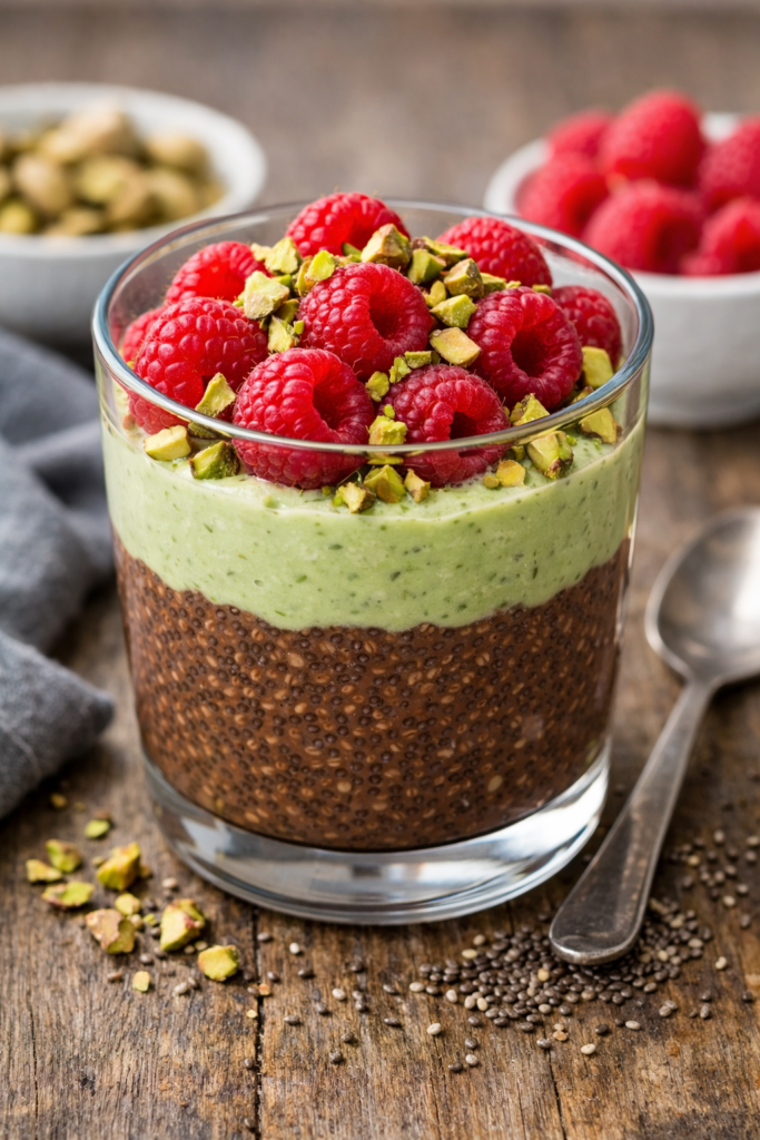 Dit chocolade-pistache chia ontbijt is een lekker en voedzaam begin van de dag. Door de combinatie van zijden tofu, chiazaad en een romige pistachecrème bevat het aardig wat plantaardige eiwitten en vezels.